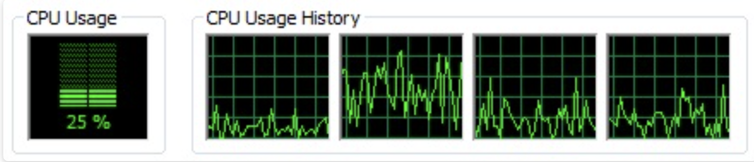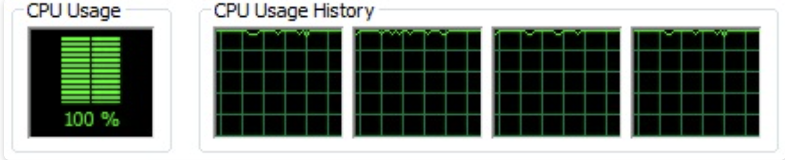 To get the real benefits of threading, we have to run in a native threads environment. The threaded version running under JRuby kept all four CPUs busy until complete: